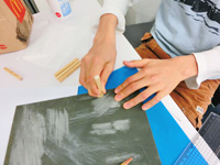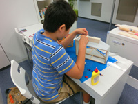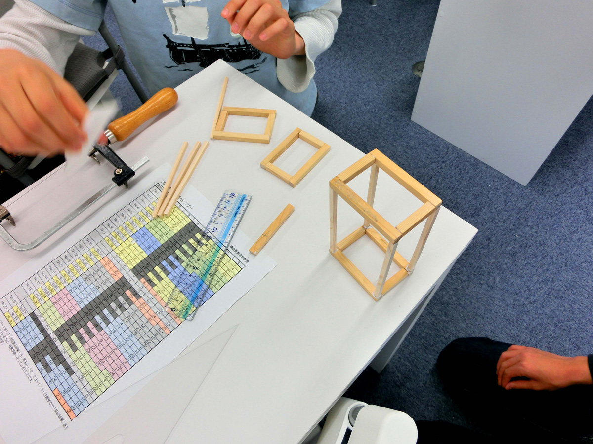 カッターナイフも使ったことがない子が、1年後にはカッターナイフを自由に使いこなすことができるようになります。見ていて危なっかしい子もいますがそれも勉強。精密糸ノコで角材をカットしたり、厚紙を切ったり貼ったりして家の模型をしてもらいます。ミリメートル単位での精度を要求します。手を動かすことによって、脳が知らないうちに鍛えられます。また緻密さや最後まであきらめない気持ちが徐々に身についてきます。面倒くさがりのお子さんには特にお薦めです。